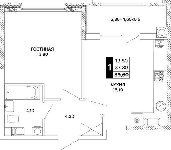 1-комнатная — 39,6 м²