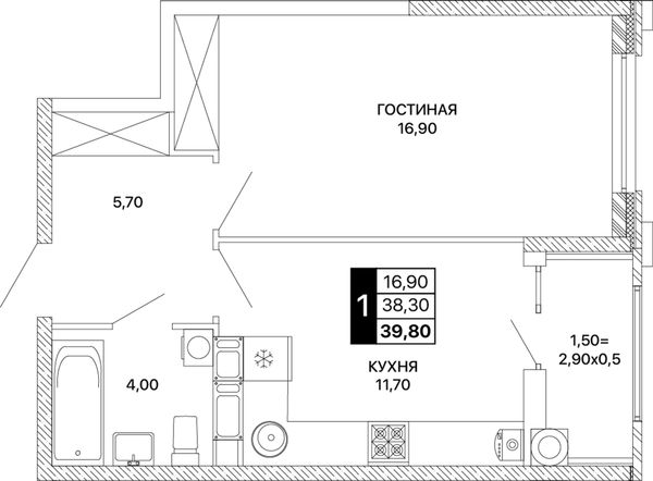 1-комнатная — 39,8 м²