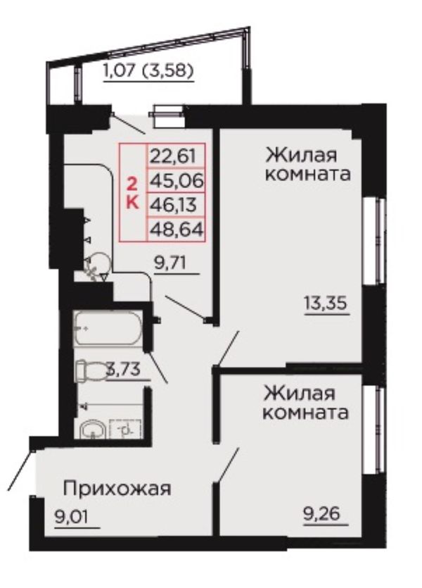 2-комнатная — 46,13 м²