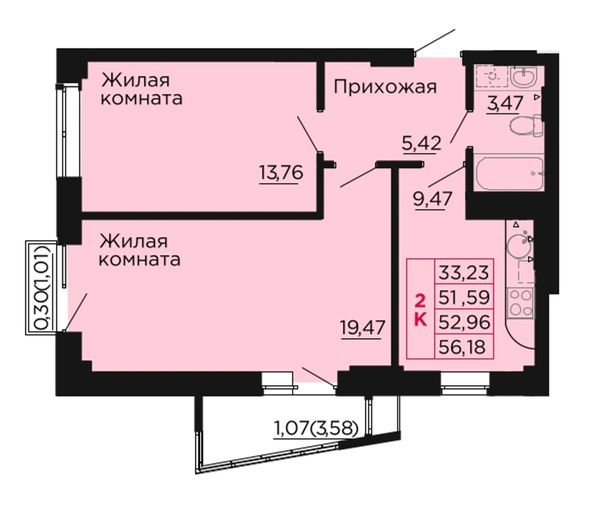 2-комнатная — 52,96 м²