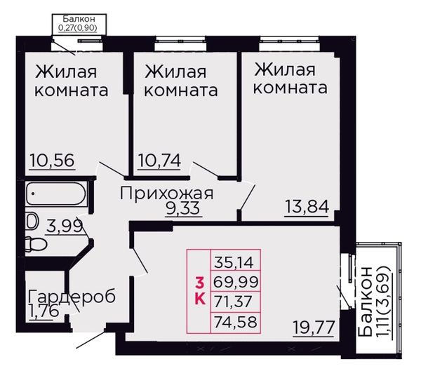 3-комнатная — 71,37 м²