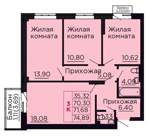 3-комнатная — 71,68 м²
