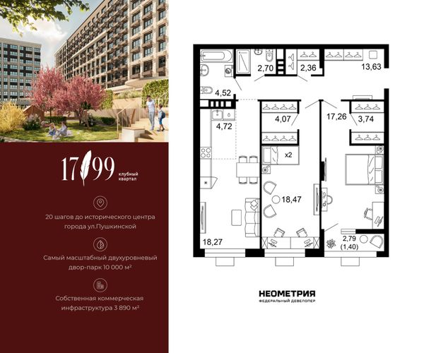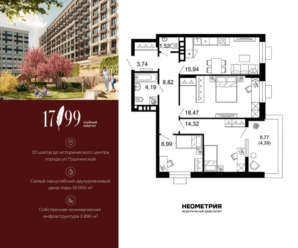 Купить трёхкомнатную квартиру в ЖК «Жилой квартал 1799» в Ростове‑на‑Дону