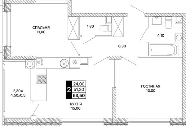 2-комнатная — 53,5 м²
