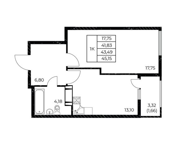 1-комнатная — 42,79 м²