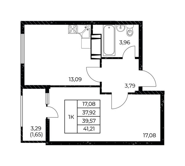 1-комнатная — 41,21 м²