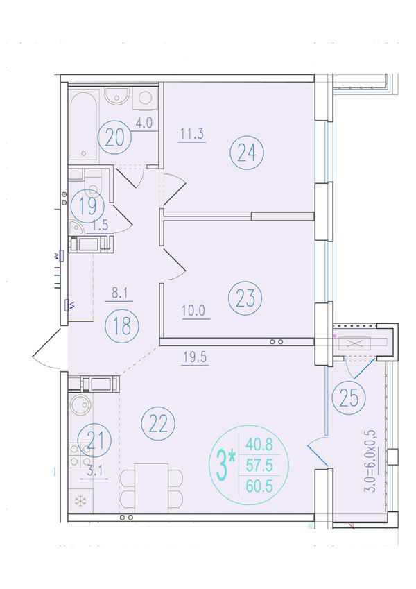 3-комнатная — 60,5 м²