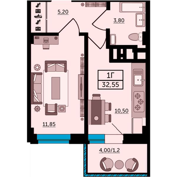 1-комнатная — 33,4 м²
