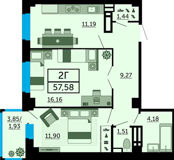 2-комнатная — 57,58 м²