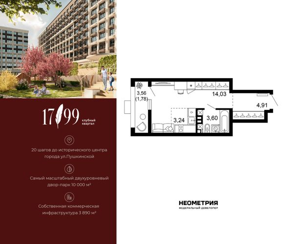 1-комнатная — 27,56 м²