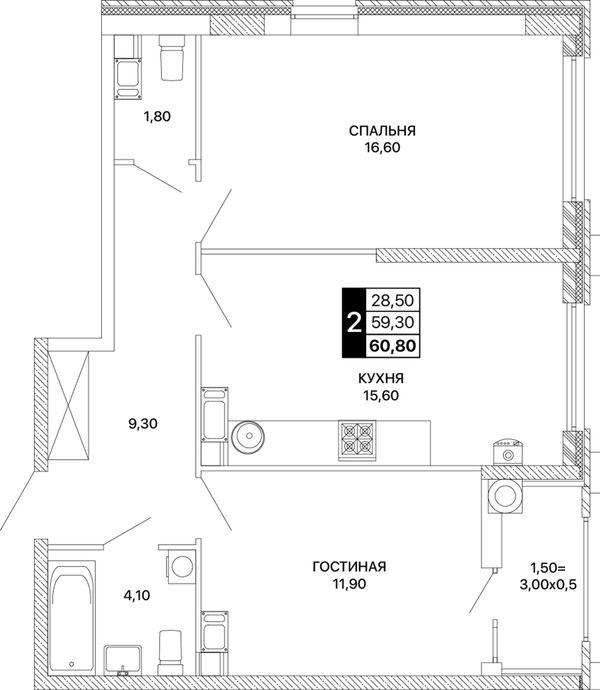 2-комнатная — 60,8 м²