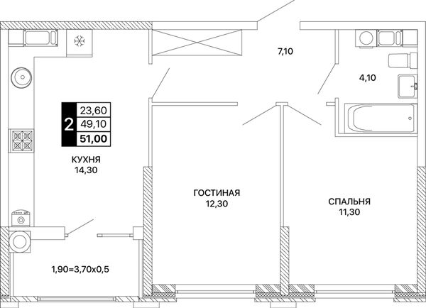2-комнатная — 51 м²