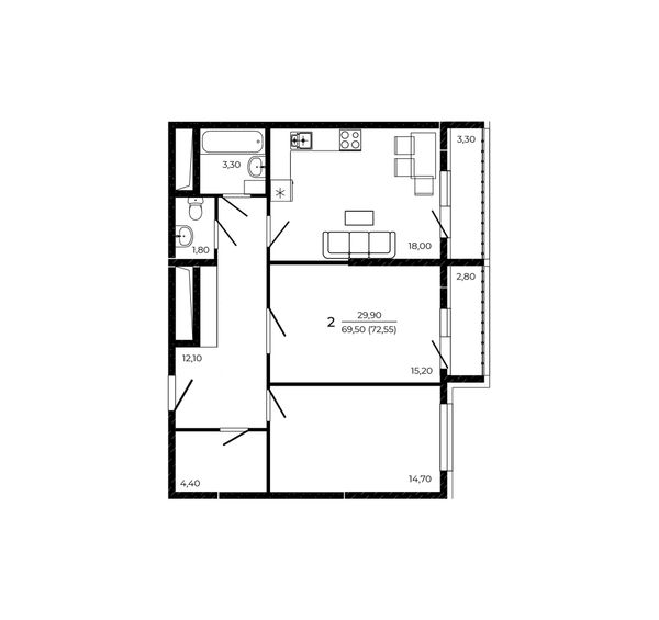 2-комнатная — 72,55 м²