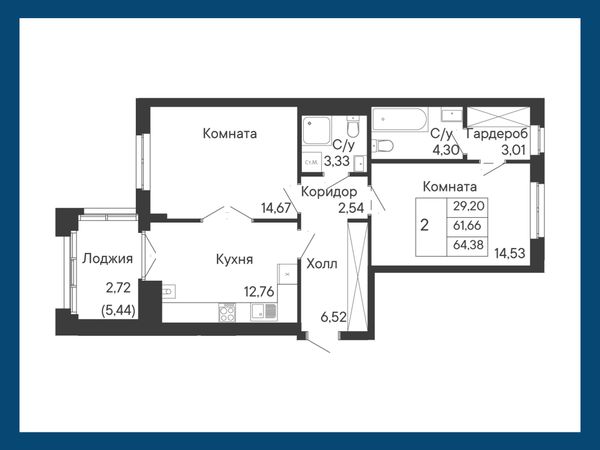 2-комнатная64,38 м²Ростовская область, Ростов-на-Дону, Бориславский переулок, 47