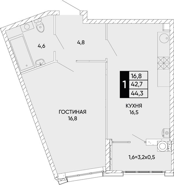 1-комнатная44,3 м²Ростовская область, Ростов-на-Дону, Левобережная улица