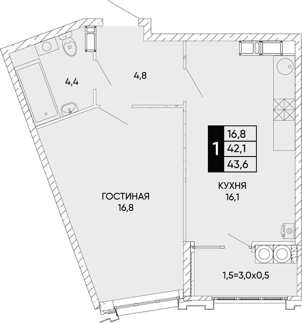 1-комнатная43,5 м²Ростовская область, Ростов-на-Дону, Левобережная улица