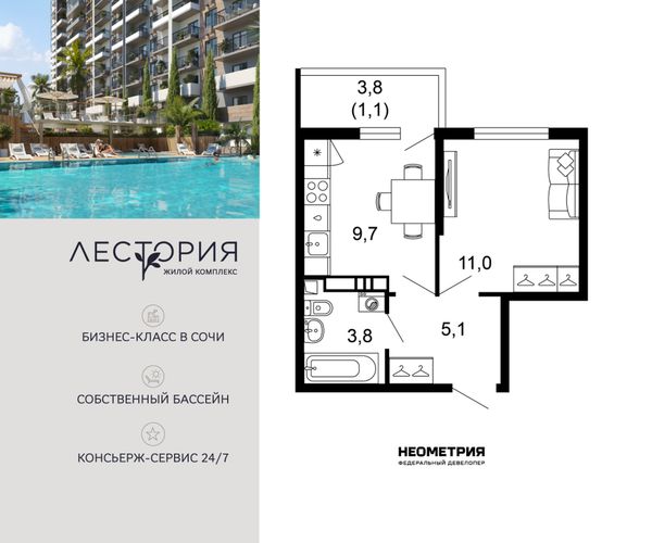 1-комнатная — 38,5 м²