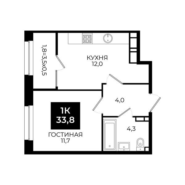1-комнатная — 33,8 м²