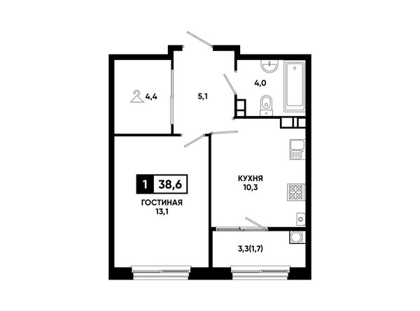 1-комнатная — 38,6 м²