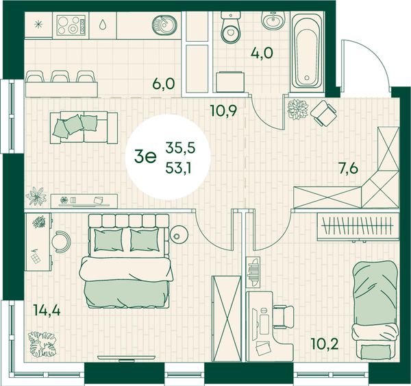 3-комнатная — 53,1 м²